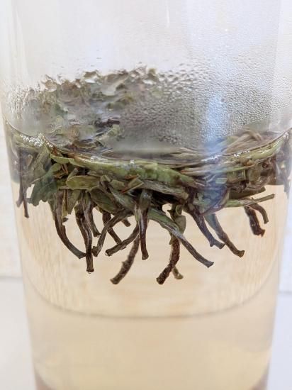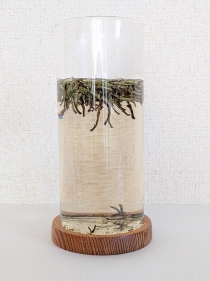 茶葉は水を吸うと次第に立ち、まるで槍の矛先のように水面に整列します。茶葉を摘む際に意図的に茎部分をつけて摘むためにこのような現象が見られます。直立した茶葉の浮き沈みや、グラスの中で煌く白毫をゆったりと愉しんでください。